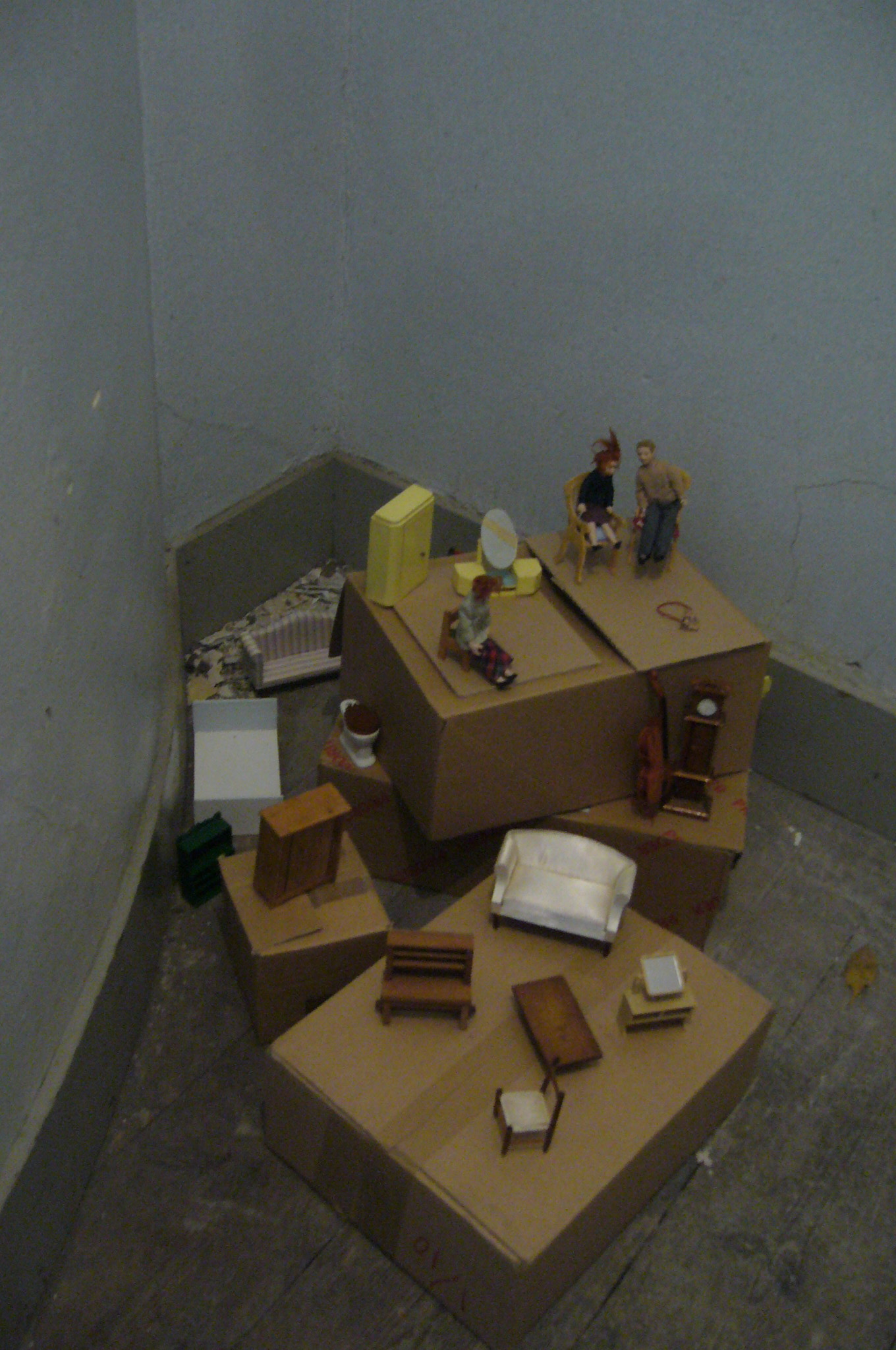 The project consisted of an installation of packing boxes and doll’s house furniture plus a recorded soundtrack of us reading a poem we had written jointly. We also had a poster where we invited people to respond to the questions ‘What would you take with you/leave behind if there was a flood…?’ and I turned their responses into a new poem which I read at a spoken word evening during the festival.