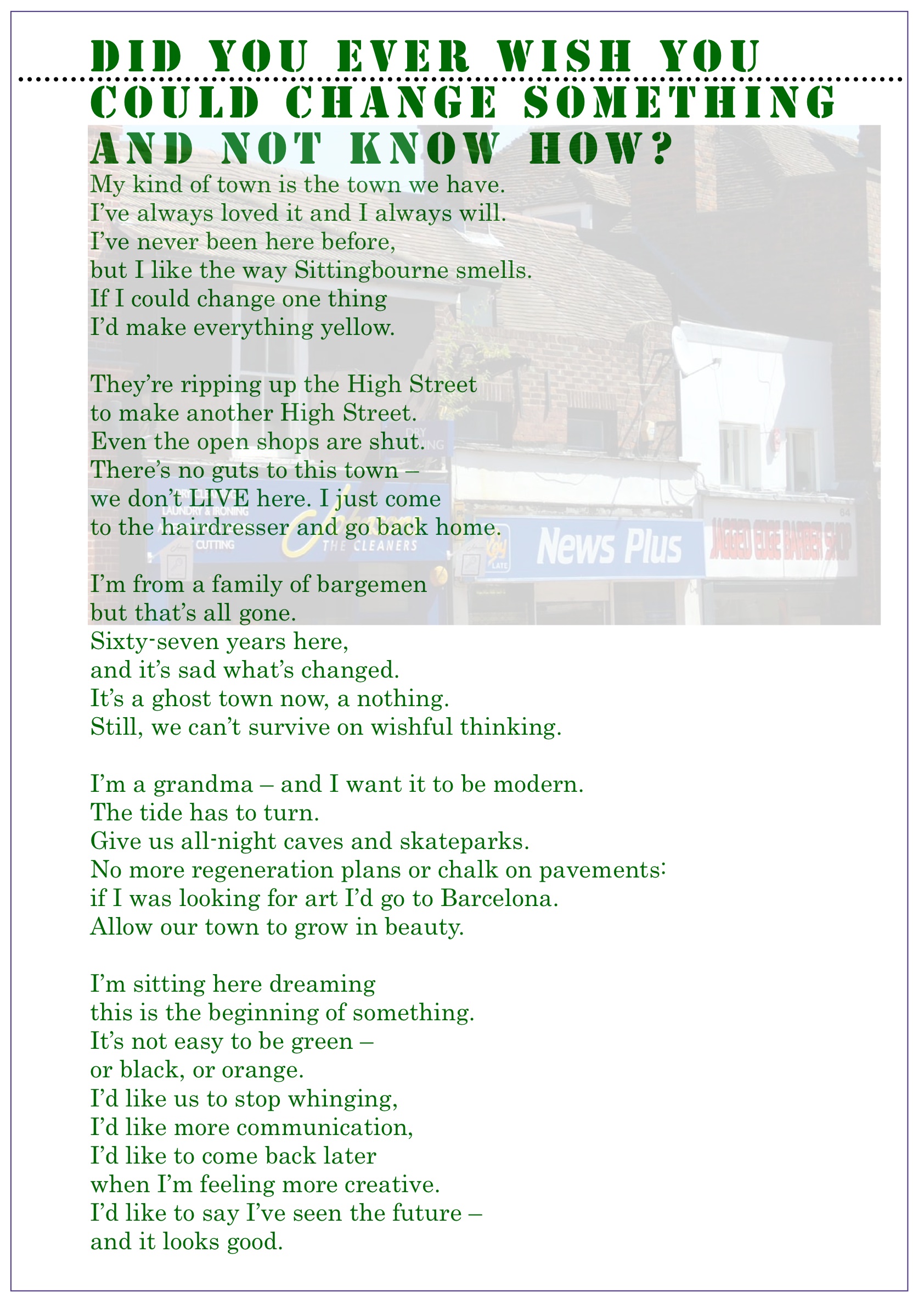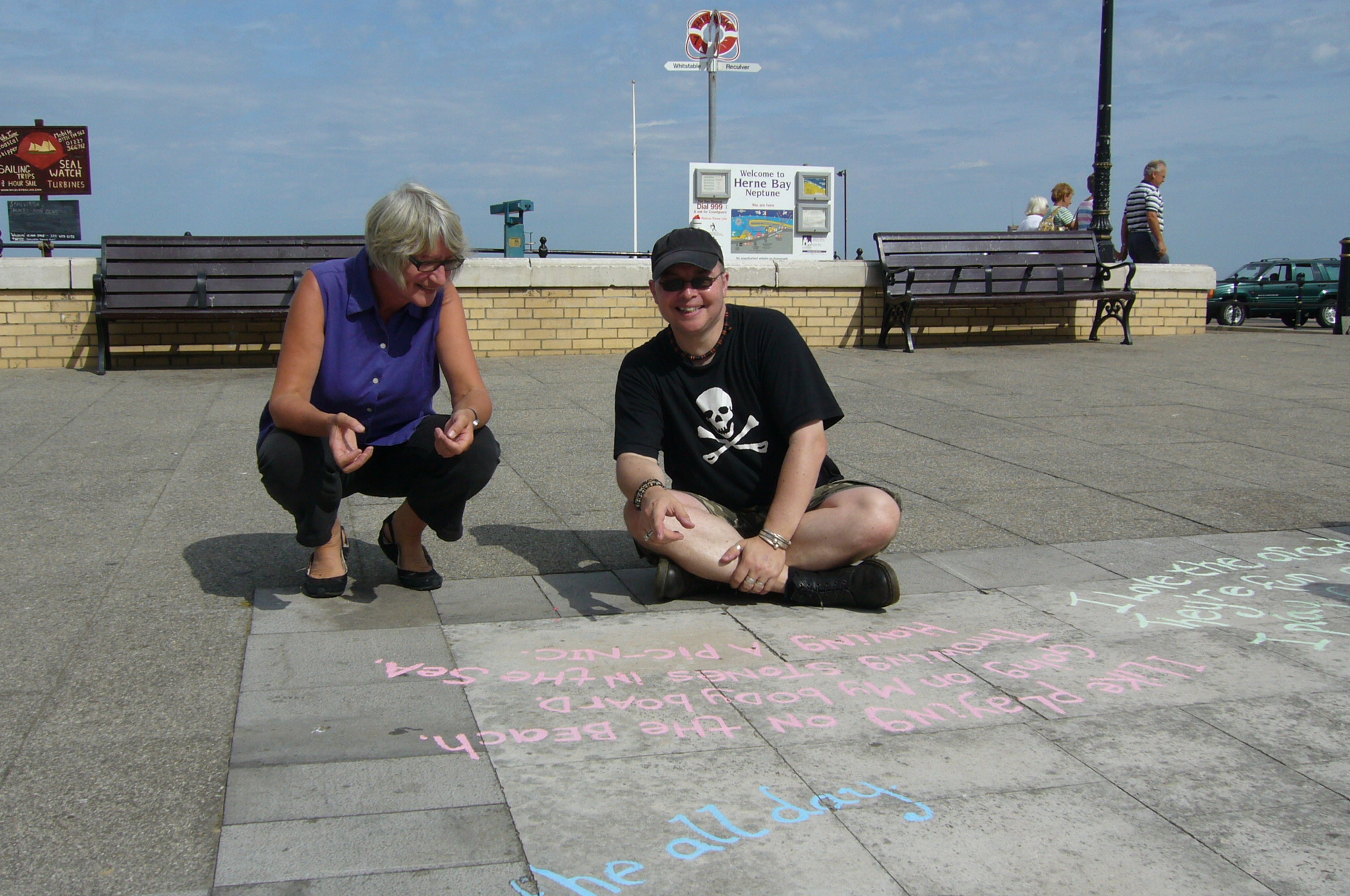 For re:bourne and the Folkestone Triennale we asked passers-by questions to elicit their ideas about the towns they lived in. We then chalked their answers on the pavements and used the results to elicit more responses and eventually to make new poems of our own, like the one below. For the 2009 Herne Bay Festival we asked residents and visitors to write poems inspired by the town and surrounding area.